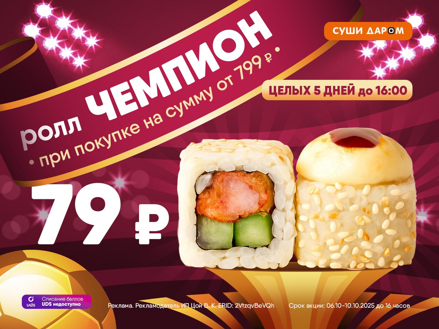 Заказывай на сумму от 799₽ и забирай наш топовый запечённый ролл Чемпион всего за 79₽![br][br][emoji=<3]Суши Даром — побеждай во вкусе каждый день![br][br]*Срок действия акции с 6 по 10 октября 2025 г, до 16:00.[br]**Количество ограничено, подробности уточняйте у кассиров.[br]*** 1 чек - 1 товар. Не суммируется с акцией "Подарок на самовывоз".[br]****Списание баллов UDS невозможно.