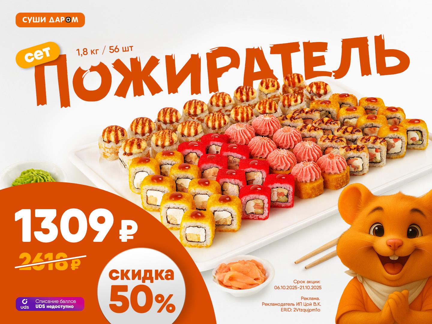 [emoji=:heart_eyes:]1,8 кг за 1309 ₽[br][br]Он съест твой голод и оставит только довольные лица за столом.[br][br]Готов рискнуть и победить аппетит? Тогда этот сет твой.[br][br] Срок действия акции с 6 по 21 октября 2025 года.[br]*Списание баллов UDS невозможно.[br]**Количество товара ограничено, наличие товара уточняйте у кассира по телефону 8 (923) 492-76-66