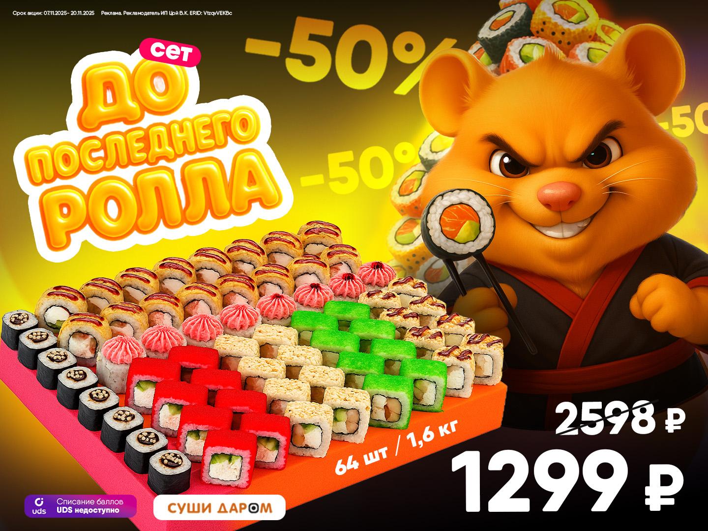 Сет «До последнего ролла» — 1,6 кг удовольствия за 1299 ₽ [emoji=:heart_eyes:][br]Каждый момент с ним — это наслаждение, которое хочется продлить.[br]Кусочек за кусочком… пока не останется ни одного.[br]Почувствуй вкус, от которого невозможно оторваться [emoji=:orange_heart:][br][br]Срок действия акции с 7.11.2025- 20.11.2025[br]*Списание баллов UDS невозможно.[br]**Количество товара ограничено, наличие товара уточняйте у кассира по телефону 8 (923) 492-76-66