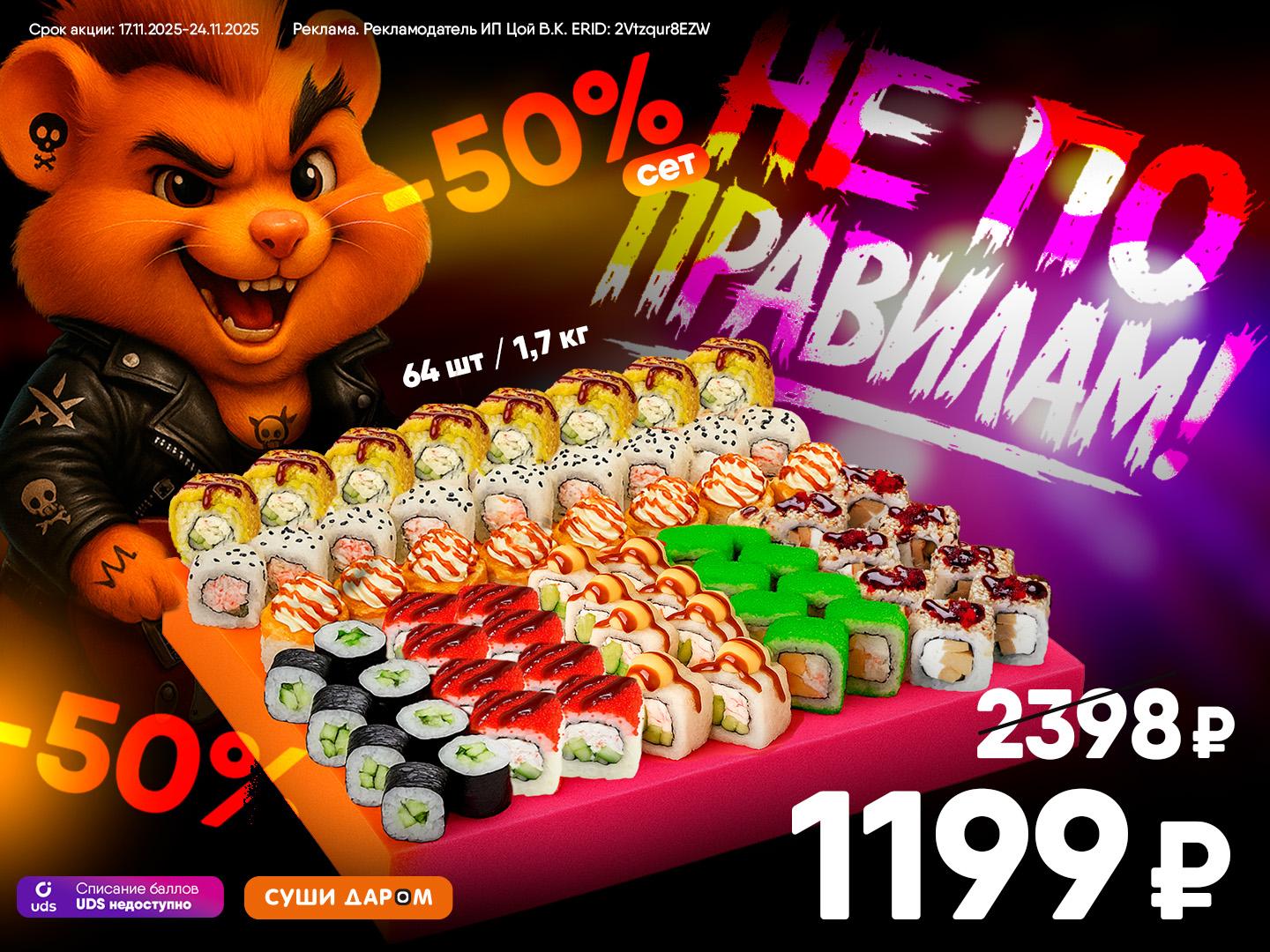 Иногда правила нужны…[br]Но точно не в этот раз [emoji=:smirk:][br]⠀[br]Мы взяли максимум начинки, собрали хиты, сделали 1,8 кг вкуса — и вырубили цену до 1199 ₽.[emoji=:orange_heart:][br]Да, это звучит неправильно.[br]Да, так «не делают».[br]Но нам можно — мы Суши Даром [br][br]Никаких ограничений. Только роллы. Только много.[br]Для тех, кто кайфует, когда всё не по правилам.[br][br] Акция действует с 17.11.2025 по 24.11.2025[br]* Списание баллов UDS недоступно.[br]** Количество товара ограничено, наличие уточняйте у кассира по телефону 8 (923) 492-76-66
